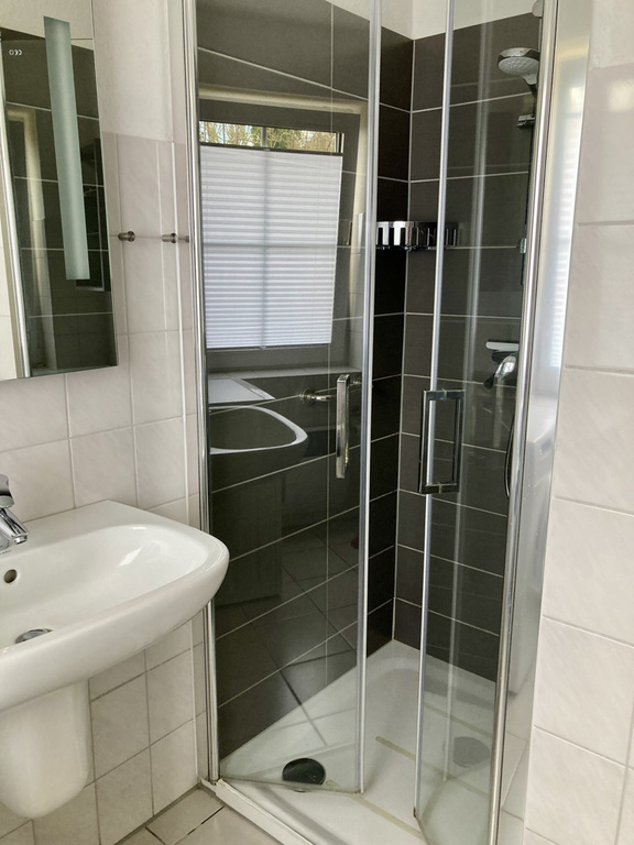 Im Badezimmer gibt es eine Dusche mit einem niedrigen Einstieg und eine Waschmaschine.